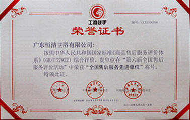 凭借“1350阳光服务体系”,小优视频下载卫浴被授予“全国售后服务先进单位”称号。